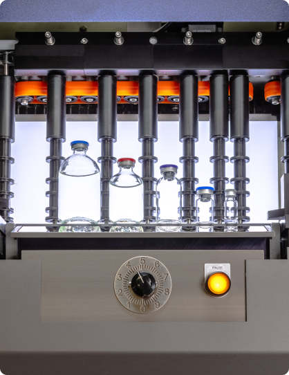 The DI-100 Inspection System is designed to enhance human inspection of vials, ampules, and syringes by providing a automated material handling and a consistent visual inspection presentation through lighting and rotation.